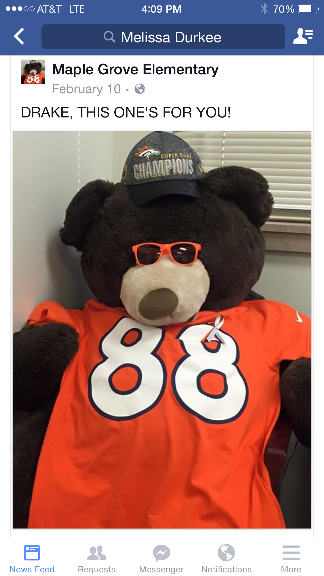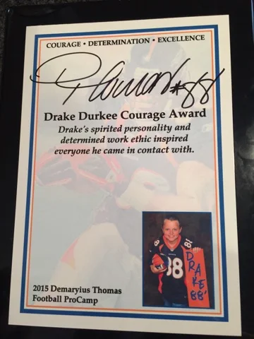 Demaryius Thomas (of the Denver Broncos) holds a large football camp at Mullen High School annually. This camp is for young children - high school age. Demaryius was really touched by Drake's story and he wore Drake's bracelet throughout the 2015 season and in the Super Bowl. He continues to wear the bracelet today. He has created the Drake Durkee Courage Award and he awards this prestigious award each year to the camper who exhibits the most courage during camp (or in working to attend camp)