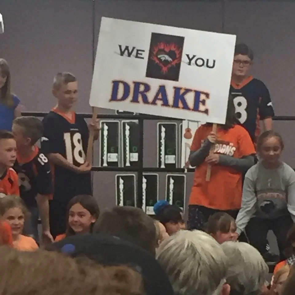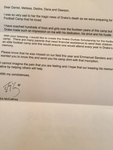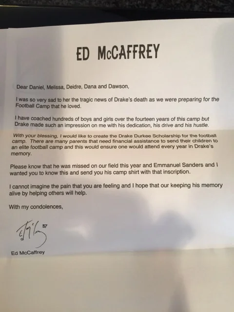 Ed McCaffrey (a former Denver Bronco) has created a $1,000 scholarship in Drake’s name to attend his football camp each year.